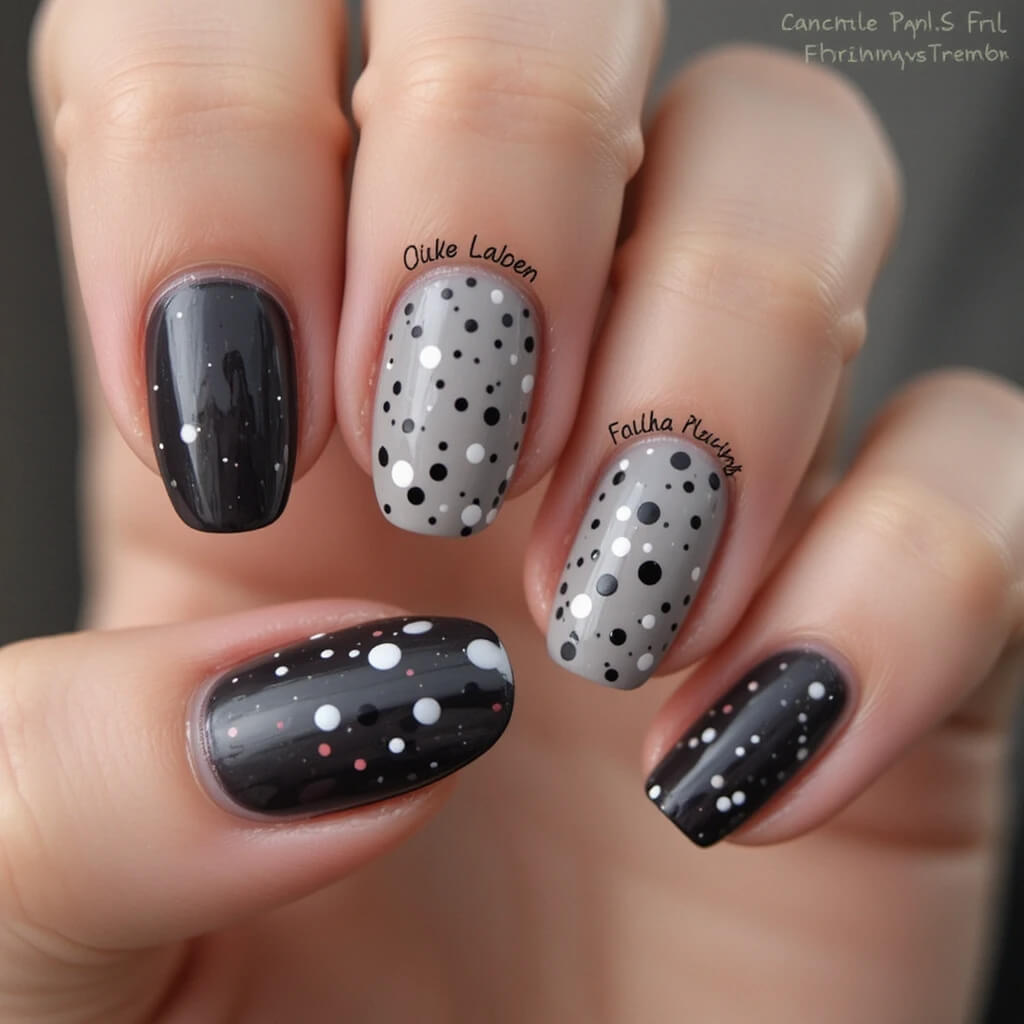 This fall nail, graphic details are being paired with moody, understated palettes. Think polka-dot clusters, single dot accents, and minimal lines.