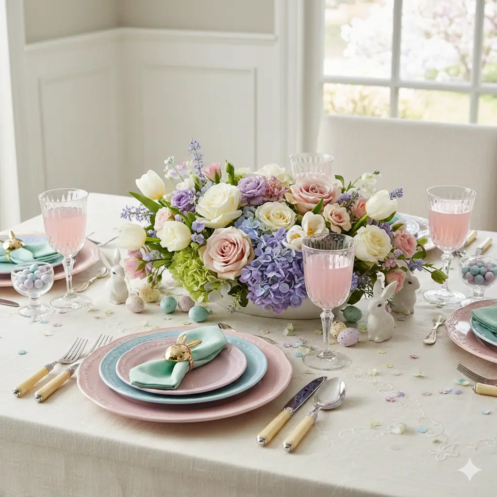 - Dinnerware: Choose plates in soft pastel shades or white plates with delicate floral accents. Mixing pastel colors adds visual interest without overwhelming the table.