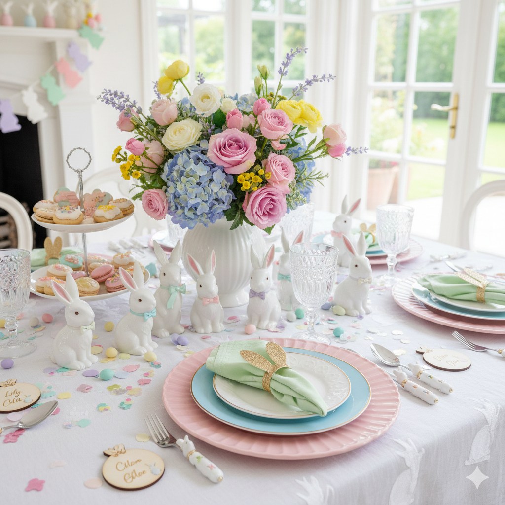 - Bunny accents: Ceramic bunny figurines, bunny-shaped napkin rings, or place cards with bunny ears instantly set the mood.