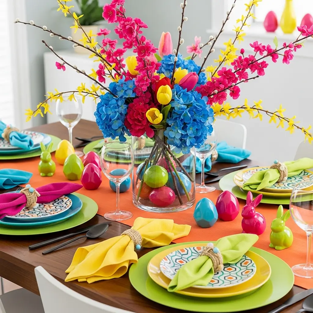If you love bold décor, this vibrant Easter table setting is for you. It celebrates color, creativity, and contemporary design.