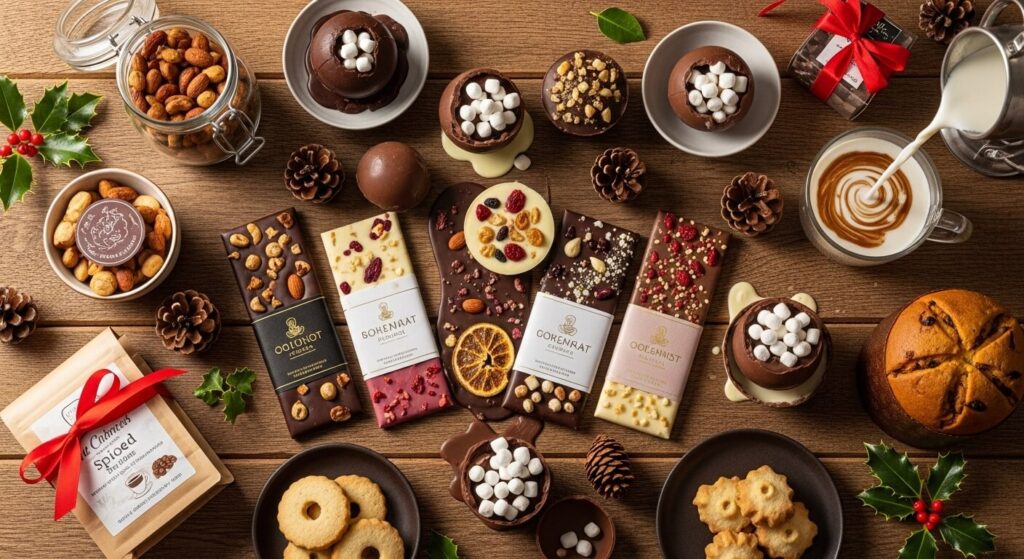 • Artisan chocolate bars or truffles: Go for festive packaging or unique flavors like sea salt caramel or peppermint bark.