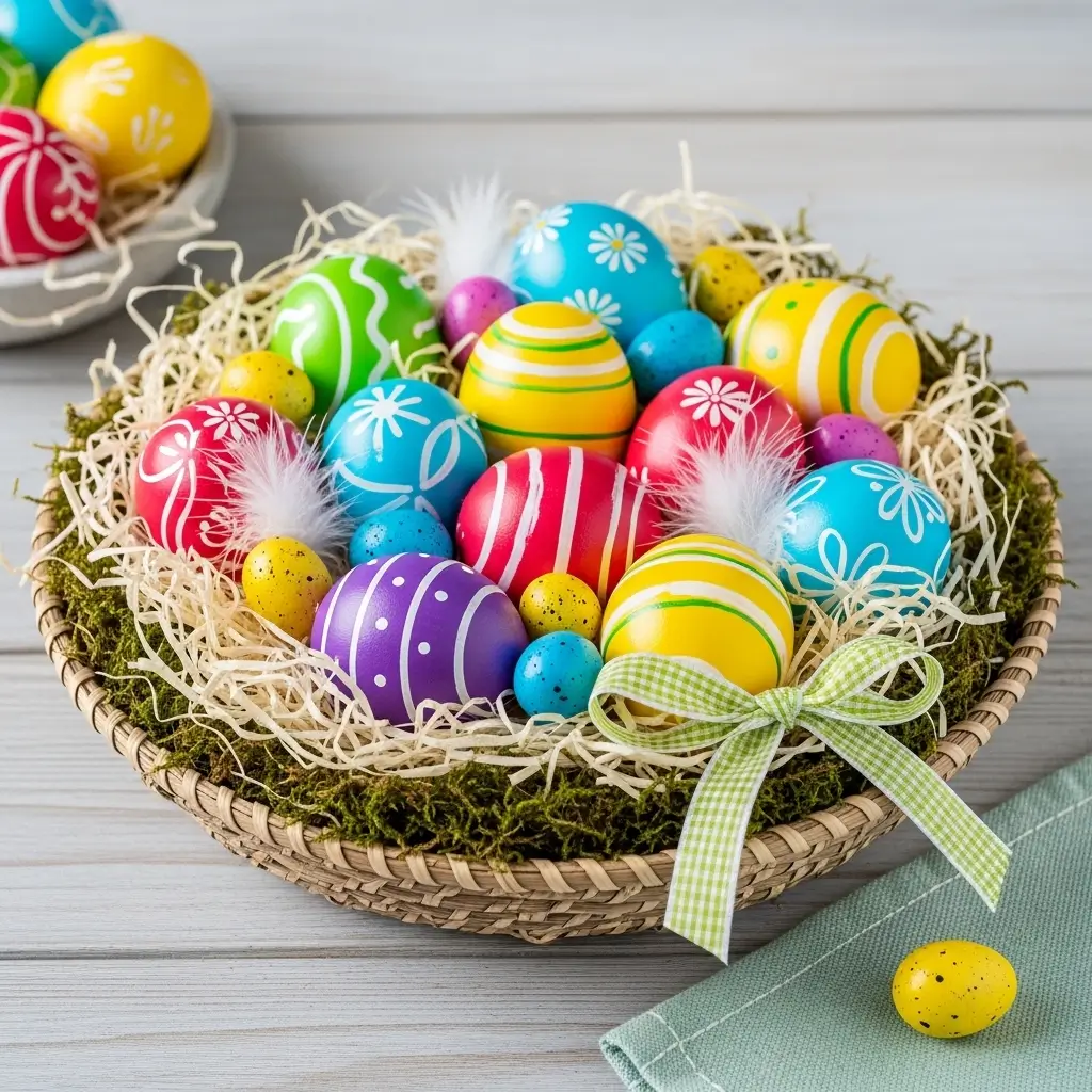 Start with a decorative basket or woven tray. Fill the bottom with shredded paper, straw, or moss to create a soft nest-like base. Then add brightly colored Easter eggs. These can be dyed eggs, painted wooden eggs, or even plastic eggs.
