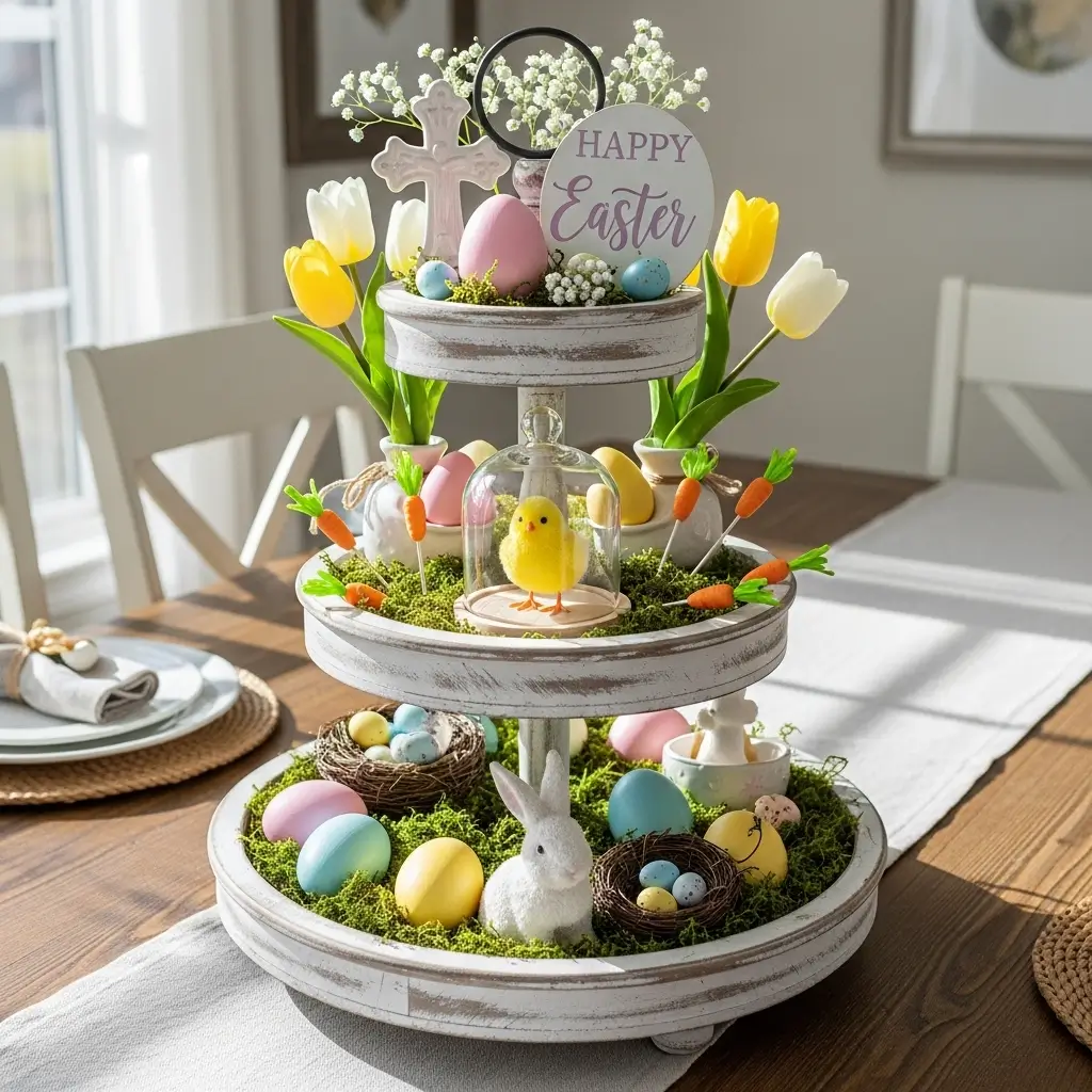 On the middle tier, arrange Easter eggs, mini baskets, or small signs with Easter messages. On the top tier, add tiny decorations like chicks, miniature carrots, or pastel candies.