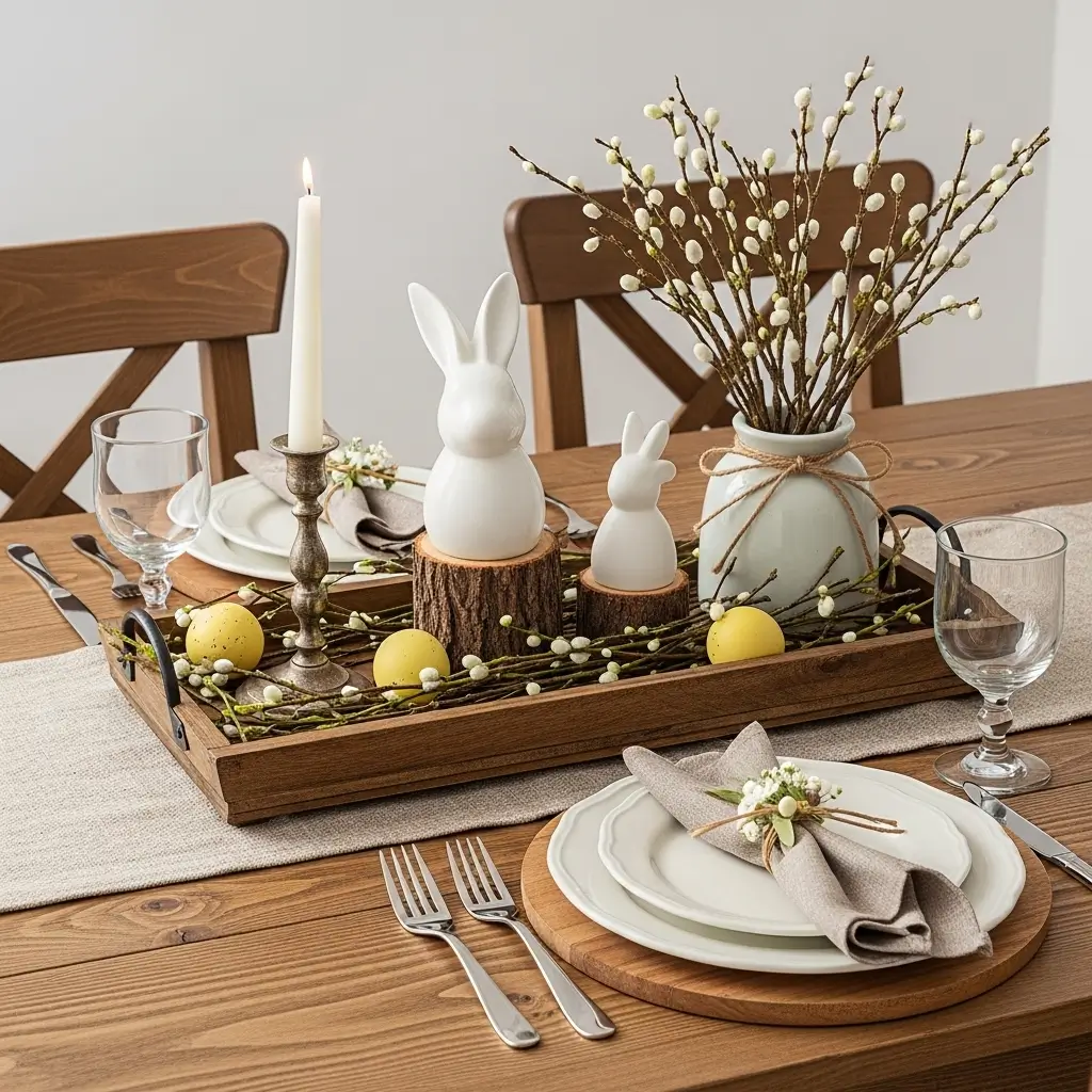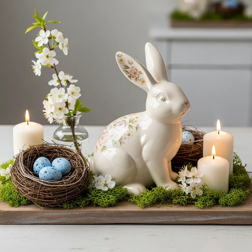 Start with a neutral base like a tray, wooden board, or decorative plate. Place a bunny figurine in the center as the main focal point. The bunny can be ceramic, wooden, or even plush depending on the style you want.