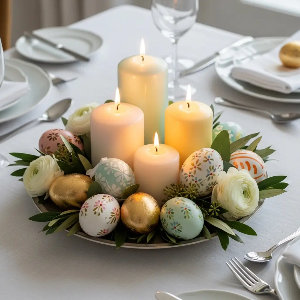 Around the candles, arrange decorative eggs in complementary colors. You can choose metallic eggs for a luxurious feel or pastel eggs for a softer design.