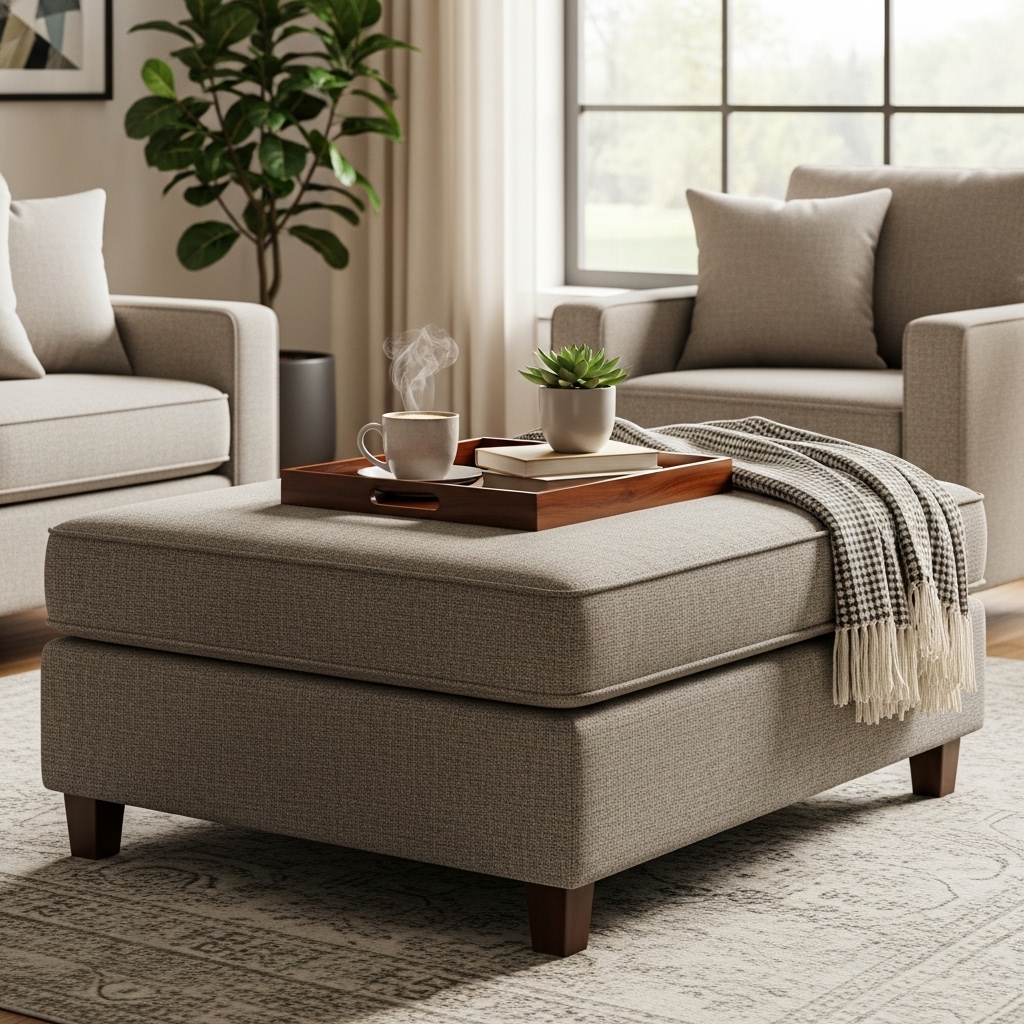 Add a sturdy tray to hold drinks and décor securely. Coordinate the fabric with sofa cushions or rugs for a cohesive look. Choose durable upholstery for high traffic areas.