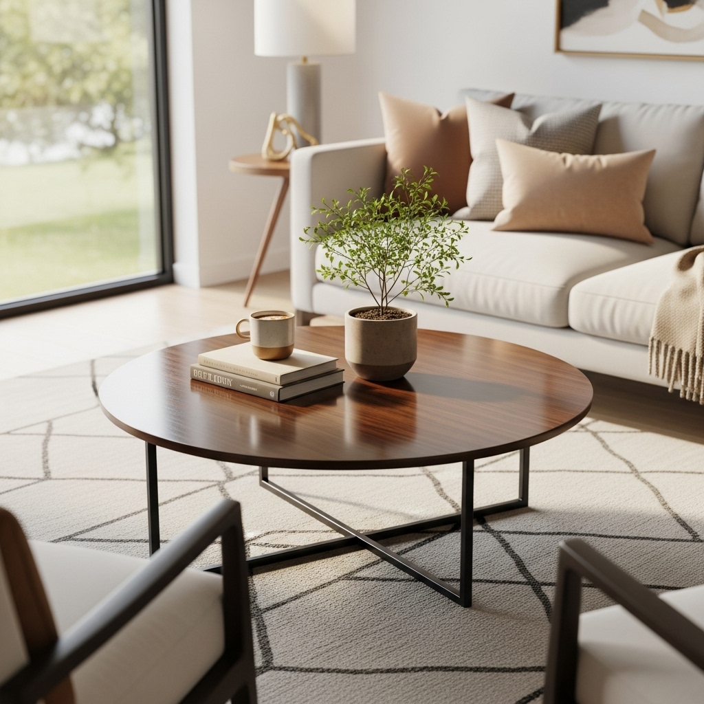 A round coffee table improves flow within the room by eliminating sharp corners. It encourages easy movement around seating areas and creates a relaxed welcoming atmosphere. This design works particularly well with sectional sofas and curved furniture.