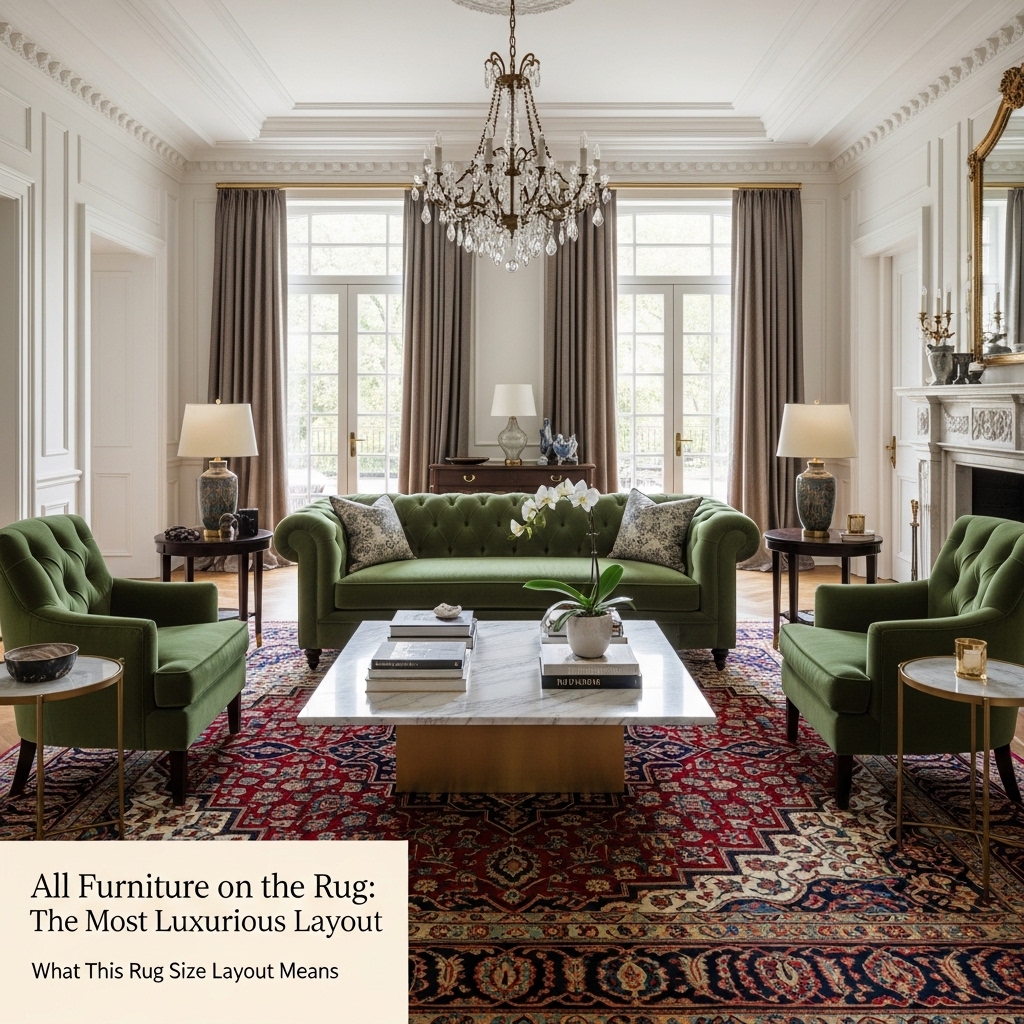 In the all-furniture-on-the-rug layout, every major piece of furniture in the living room—sofa, armchairs, coffee table, and side tables—sits fully on top of the rug. This approach creates a cohesive, grounded look and is often associated with high-end interiors.
