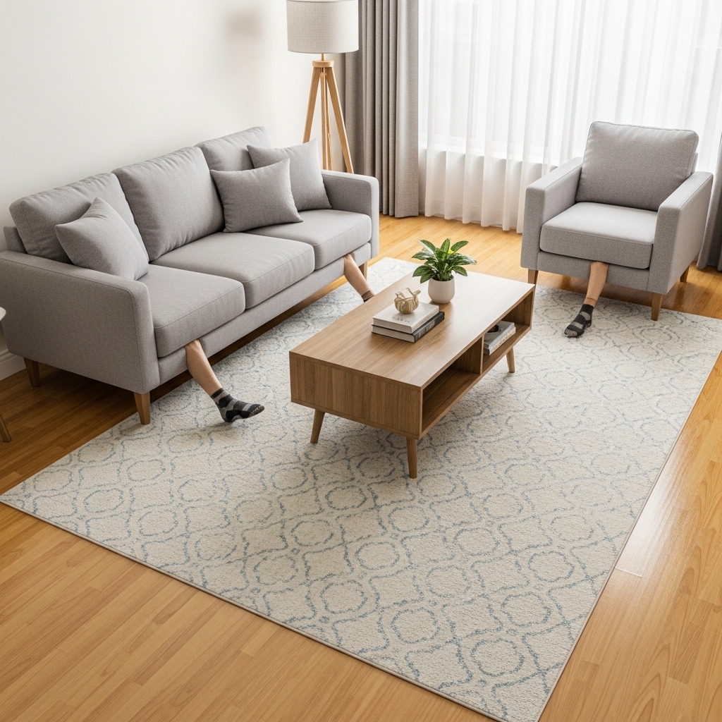 This layout works best when paired with a round or oval coffee table, which softens the visual boundaries of a smaller rug.