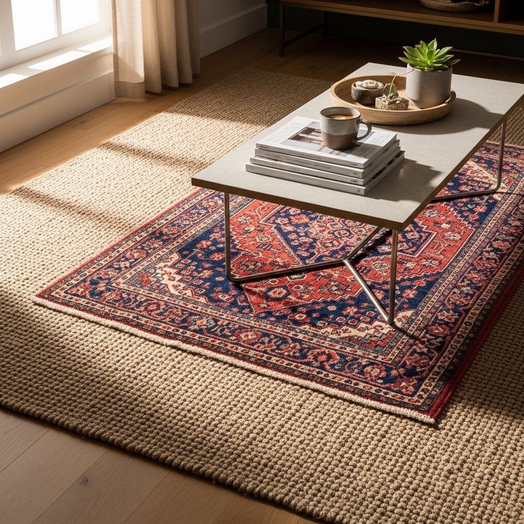 Use a neutral base rug (jute, sisal, or wool) and a patterned or colorful top rug to create contrast.