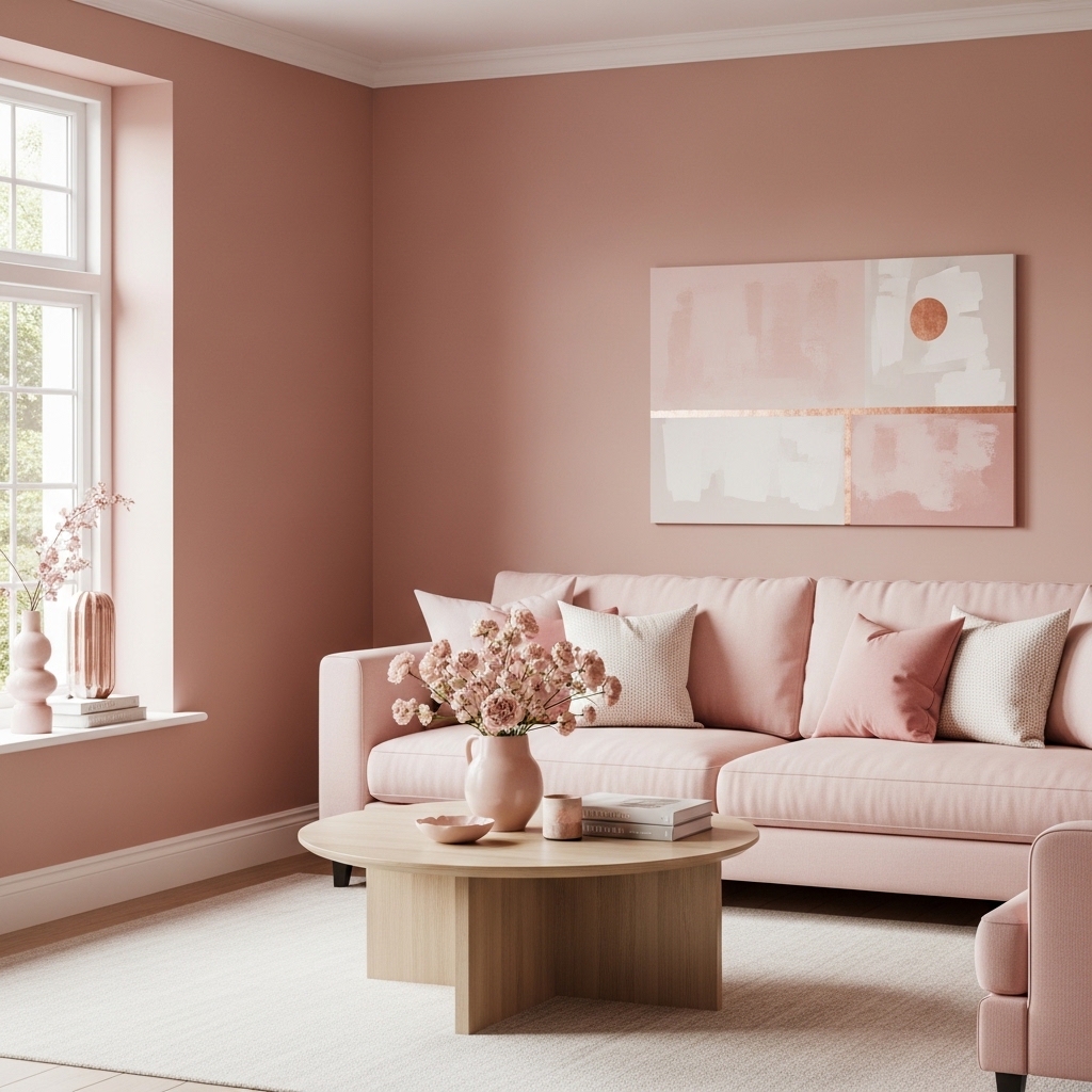 - Pair blush walls with neutral upholstery for balance.